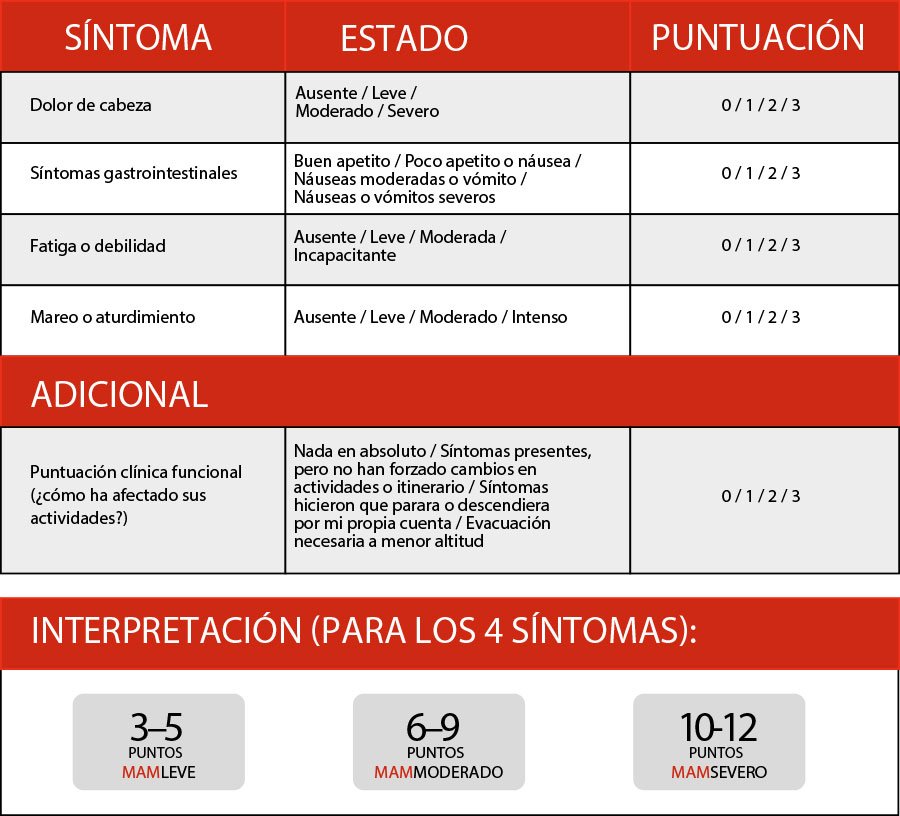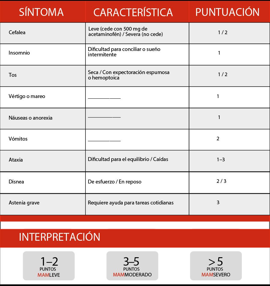 El MAM suele manifestarse entre 6 y 12 horas después de la exposición a la altitud, aunque la latencia puede variar según la susceptibilidad individual. Ante cualquier duda diagnóstica, debe asumirse que se trata de MAM hasta demostrar lo contrario (“cualquier síntoma o signos en el contexto de una ganancia reciente de altitud, es una enfermedad de altura”, principio clínico clásico ISMM).
